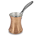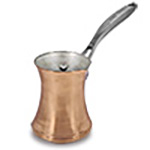 Кофейник изготовлен из сертифицированной, качественной меди марки М1М, внутренняя поверхность покрывается пищевым оловом для прочности и гигиеничности, съемная деревянная ручка с левой резьбой изготовлена из бука, ручка на крышке сделана из полированной латуни.